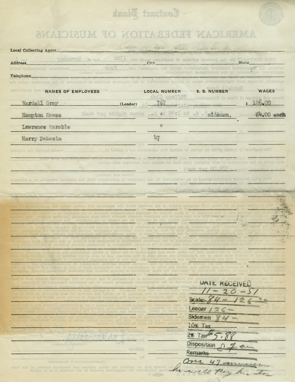 Contract for Wardell's engagement at the Tiffany Club, courtesy of Norman Saks.