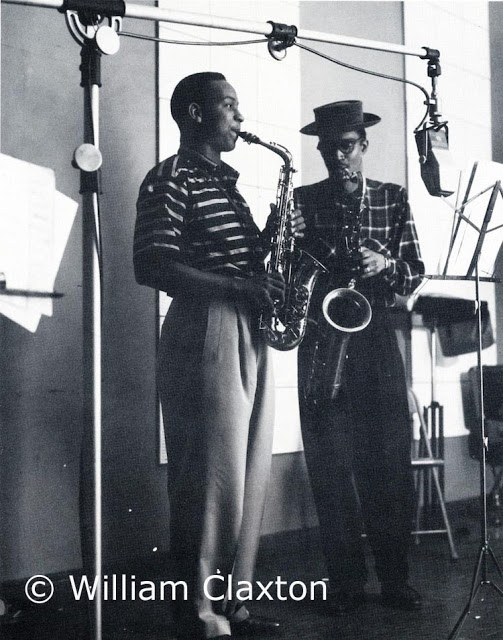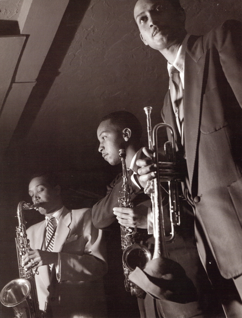 From left: Sonny Criss (as); Wardell Gray (ts); Clark Terry (tp); poss. August 1950. Photograph by Patricia Willard.