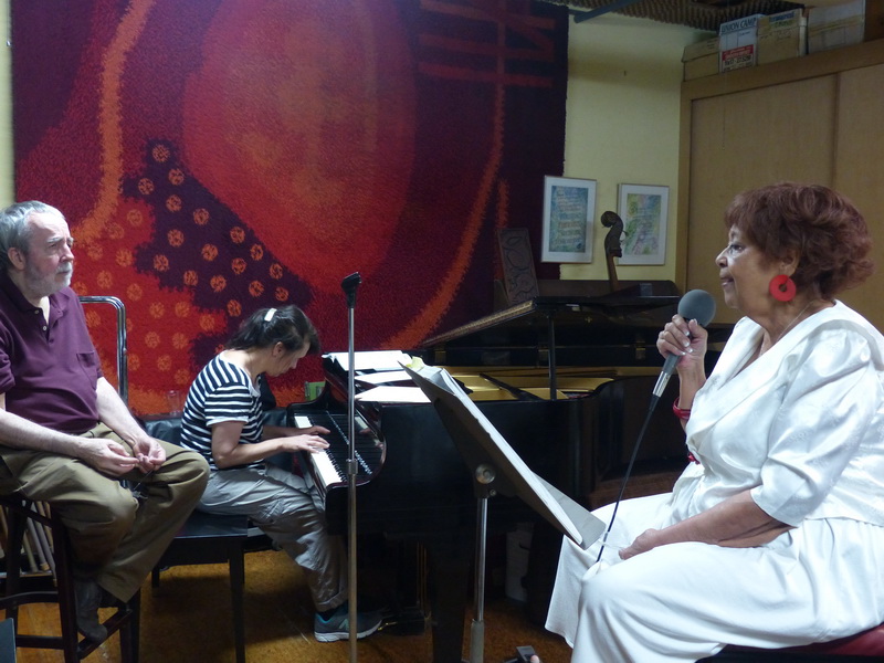 Daughter Anita Gray McClelland singing accompanied by Ceceilla Cosman on piano, while Don Sickler looks on. Photo was taken in New York City in 2014.